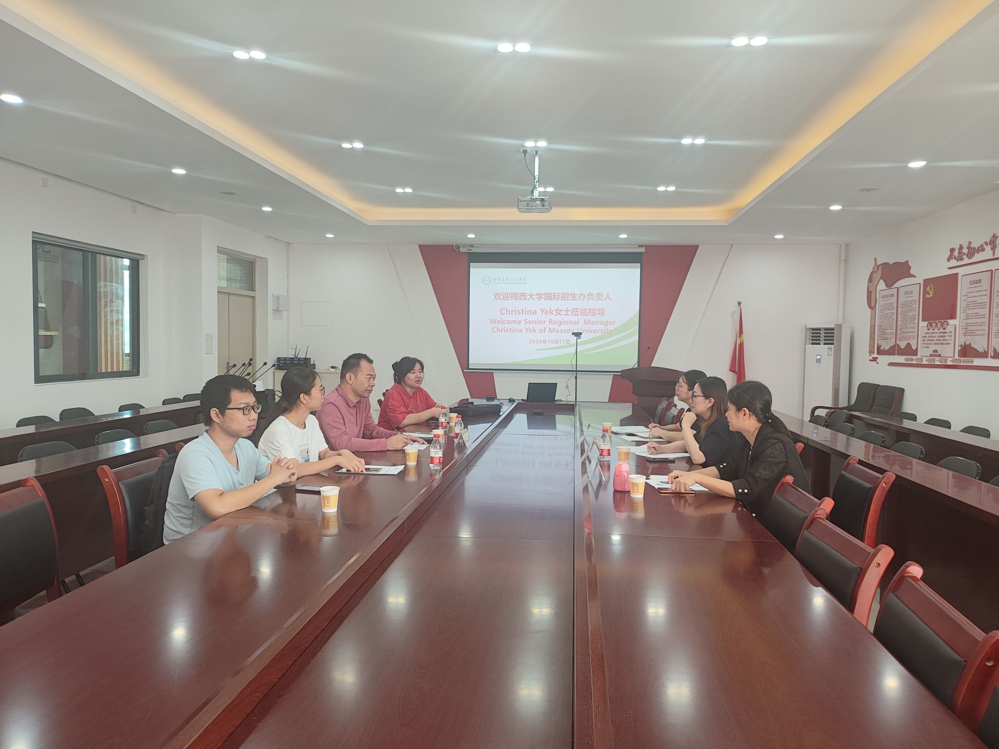 10月17日上午,新西兰梅西大学国际招生办负责人Christina Onn Ling Yek来校交流,交流会在白云校区生命科学楼607会议室举行。对外交流合作部副部长赖菊、yl23411永利集团党总支书记昌灯圣、副院长刘敏姬、国际教育科科长吴慧姗以及国际班部分学生参加会议。会议由昌灯圣主持。