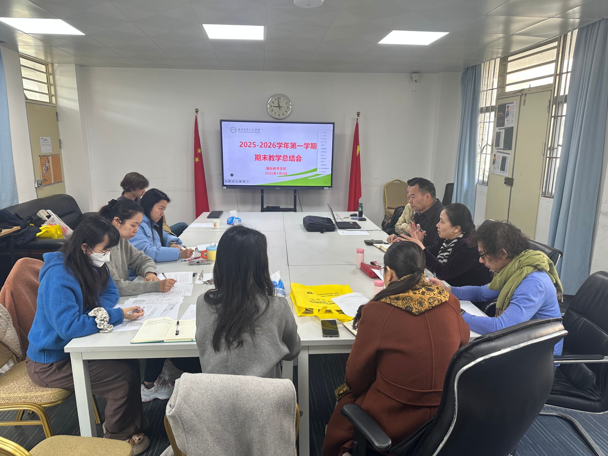 2026年1月9日,我院在海珠校区30栋304会议室召开2025~2026学年第一学期期末教学总结会议,全面复盘本学期教学工作成效,梳理现存问题,部署下学期重点任务。学院党总支书记昌灯圣、院长梅翠平、副院长刘敏姬、国际班课程教师以及国际教育科全体老师参会。