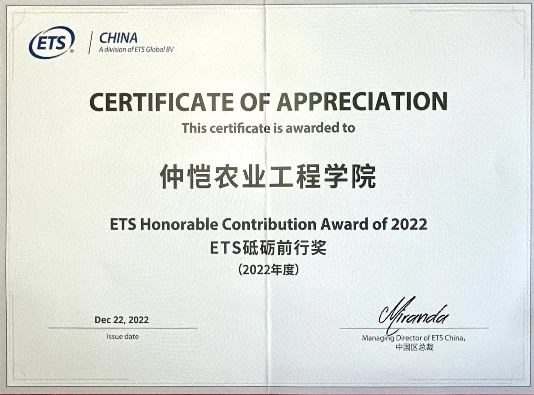 2022年12月22日在美国教育考试服务中心(ETS)举办的全国“2022托福•GRE研讨会”上,我校托福考点荣获该中心授予的全国考点“2022年度 ETS 砥砺前行奖”荣誉称号。