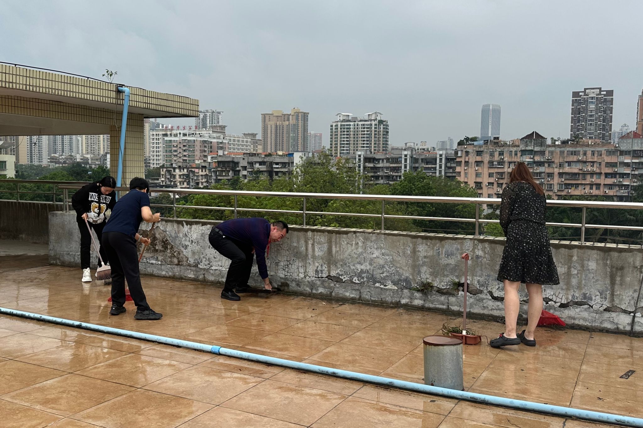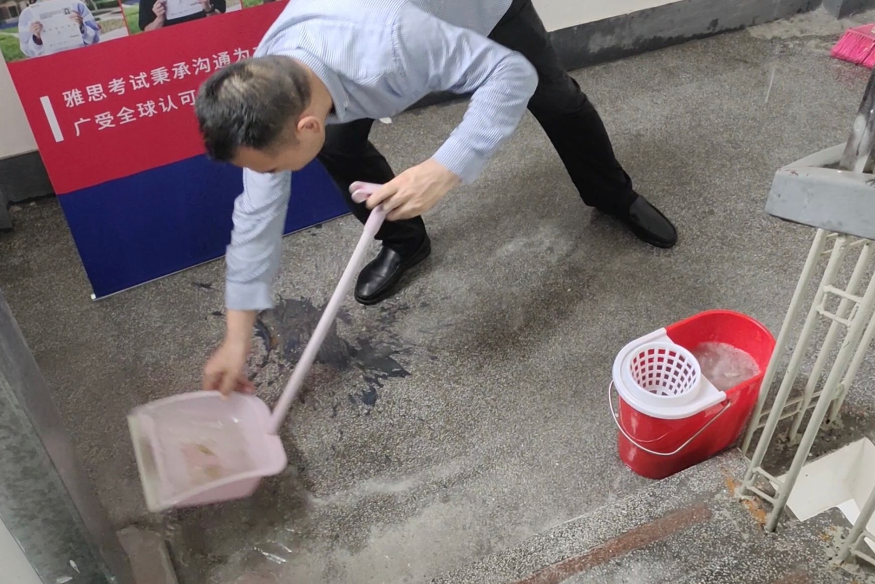 3月29日,广州遭遇罕见强降雨,短时间的强降水导致学院楼顶排水系统超负荷运转,楼顶雨水倒灌险情突如其来。而此时,yl23411永利集团正在进行雅思考试,一旦雨水渗入考场,不仅会影响考试正常开展,更会为考生带来不便甚至危险。危急时刻,学院教工党员闻令而动、迅速集结,没有丝毫犹豫,立即投入到紧急防水处置工作中。大家分工明确、默契配合,有的冒雨搬运沙袋,在楼顶入口、排水口周边筑牢防水屏障;有的俯身疏通堵塞的排水通道,徒手清理杂物、排除积水,任凭雨水浸透衣衫、污泥沾满裤脚,始终坚守在防汛一线。经过数小时的奋战,倒灌险情被成功遏制,考场环境保持安全稳定,当天的雅思考试得以顺利完成,在场考生的情绪也得到有效安抚,用速度与担当守住了考生的“追梦之路”。